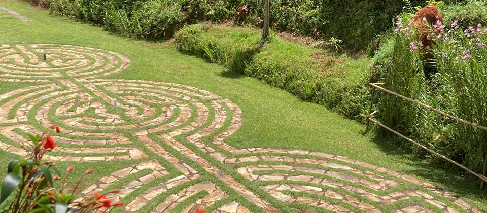 Na área externa temos disponíveis redes, sombras frescas, jardim florido, área de fogueira, trilhas, muitos elementos naturais, um maravilhoso labirinto, sala de yoga e sala de massagem.
